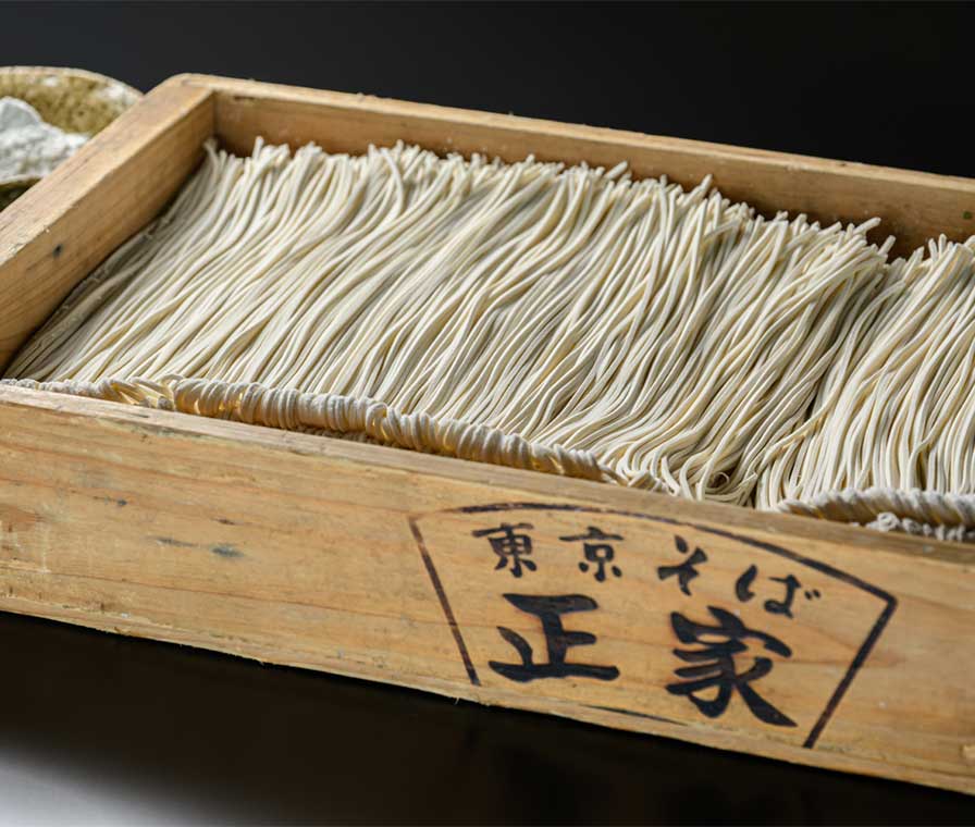蕎麦の実の中心部分だけを石臼で挽いて打った香りは控えめで甘みは豊かな白く輝く麺が特徴。滑らかなのど越しと、強いコシをお楽しみいただけます。